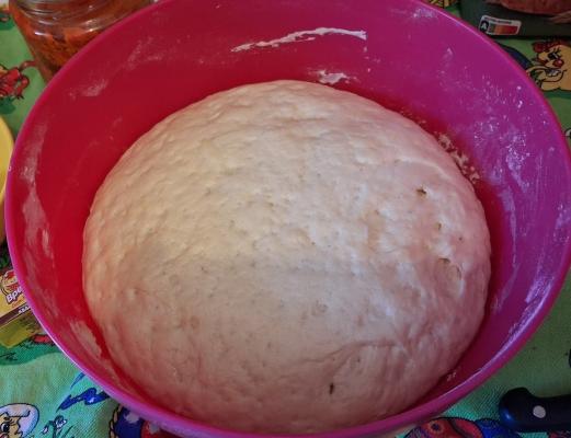 U prosejano brašno sipati rastvoren kvasac u šolji tople vode sa malo šećera. Dodati kašičicu soli i zamesiti glatko testo. Premazati ga maslinovim uljem i ostaviti da narasta oko sat vremena.