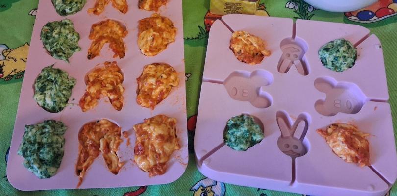 Od naraslog testa odvojiti 1/4 i podeliti je na dva dela. U jedan deo dodati kašiku ajvara, a u drugi odmrznut i oceđen spanać. Dodati malo brašna i premesiti u zelenu i narandžastu lopticu. Testo deliti na manje loptice i utisnuti u silikonski kalup sa uskršnjim motivima jaja i zeka.