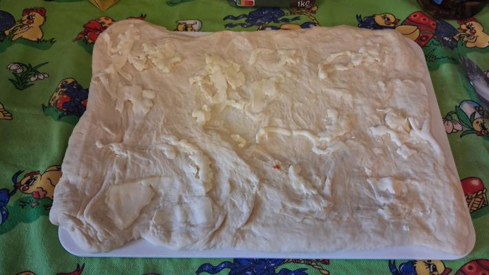 Ostatak testa (3/4) rastanjiti u pravougaonik i premazati jednom kašikom majoneza, pa preko narendati margarin.