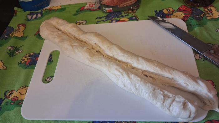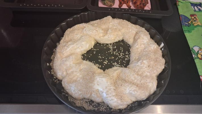 Uvijati krajeve jedan preko drugog trudeći se da presečen deo uvek bude okrenut na gore. Na kraju saviti u venčić i ostaviti da narasta, a pred samo stavljanje u rernu premazati majonezom i posuti susamom.