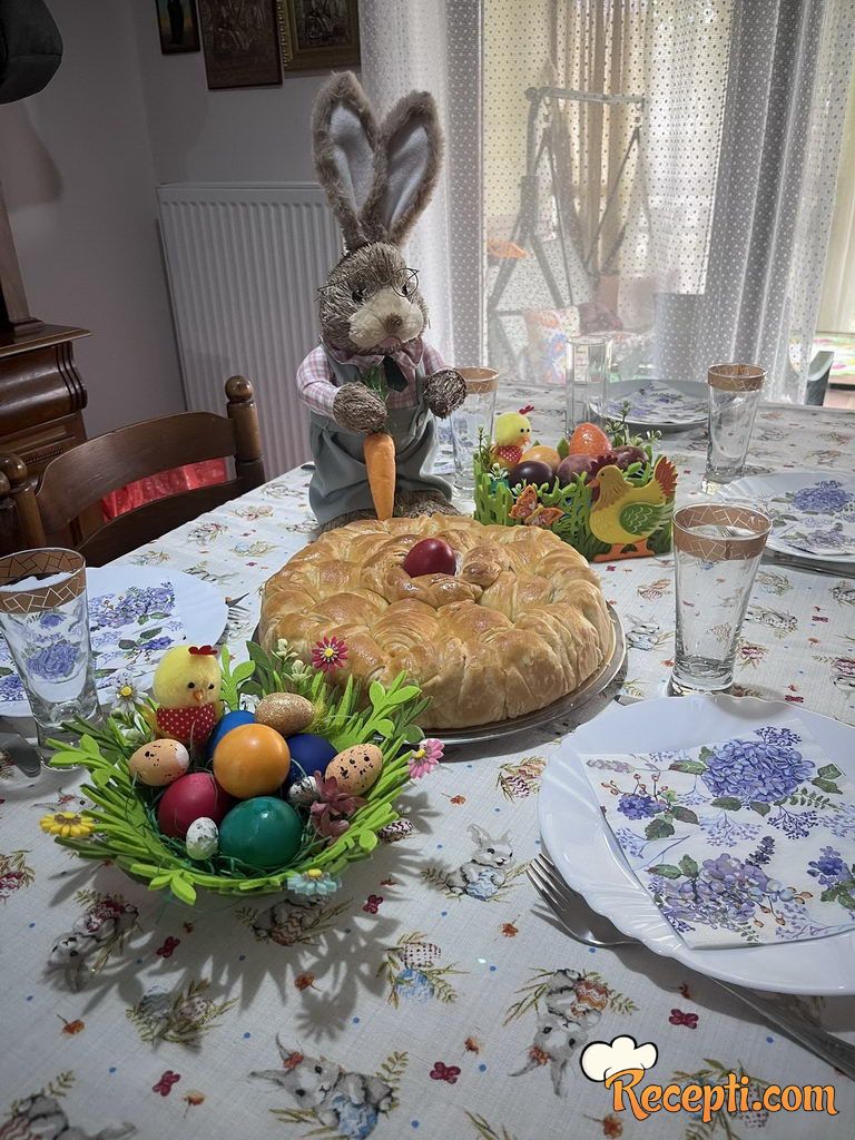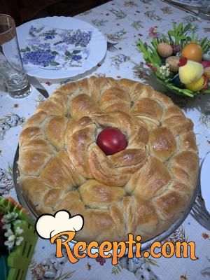 Lopticu testa, koju smo odvojili na početku, razviti tanko u elipsasti oblik. Premazati je maslacem, pa sa šireg dela viti u rolatić. Rolatić iseći po sredini, razdvojiti delove i uplesti u pletenicu (prebacajući jedan deo preko drugog). Postaviti na sredinu pogače kao krug sa dobro pritisnutim krajevima (da se ne otvore prilikom pečenja). Napraviti čvrstu lopticu od alu folije i staviti je u sredinu kruga (kada se ispeče pogača tu će se staviti ofarbano jaje). Pokri tepsiju kuhinjskom krpom i ostavi da pogača naraste 20-30 minuta.