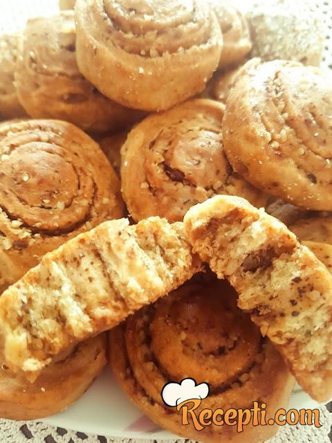 Svaki deo razvucite oklagijom krug debljine oko 5 mm pa ga pospite mlevenim pečenim lešnikom (ja sam ga izblendirala). Zatim malo pređite oklagijom po površini kako bi se lešnik spojio sa testom. Urolajte i secite na komade širine oko dva prsta. Ređajte na pouljanom plehu. Isto uradite i sa drugom polovinom testa. Pecite ih u zagrejanoj rerni na 200 stepeni oko 20 minuta (zavisno od vaše rerne). Za to vreme skuvajte sirup od vode i šećera, ni suviše gust, a ni suviše redak. Na kraju dodajte limun isečen na kolutove.