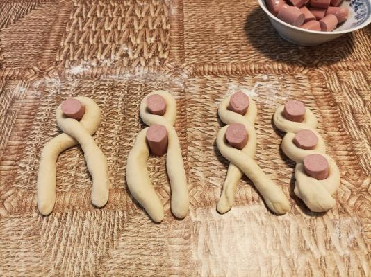 Naraslo testo prebaciti na pobrašnjenu podlogu, blago ga premesiti i podeliti na 10 jednakih delova. Svaki deo oblikovati u lopticu. Loptice testa poređati na pobrašnjenu podlogu i prekriti ih kuhinjskom krpom, dok isečete viršle. Viršle iseći na 30 komada, dužine 3 cm. Veliki pleh od električnog šporeta obložiti pek papirom i ostaviti ga na stranu.
