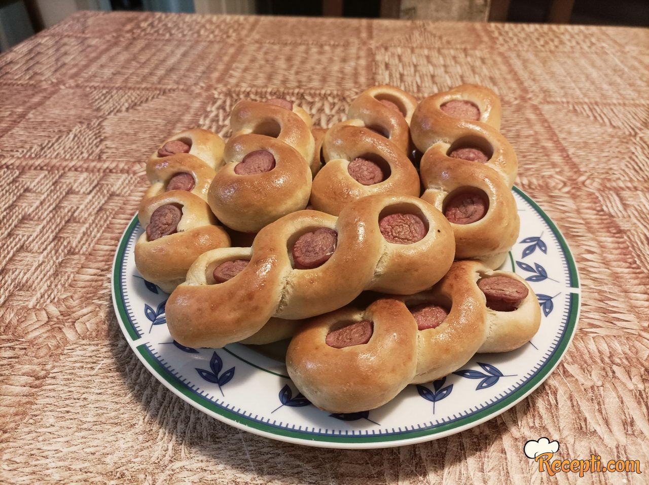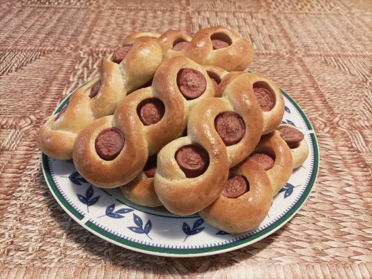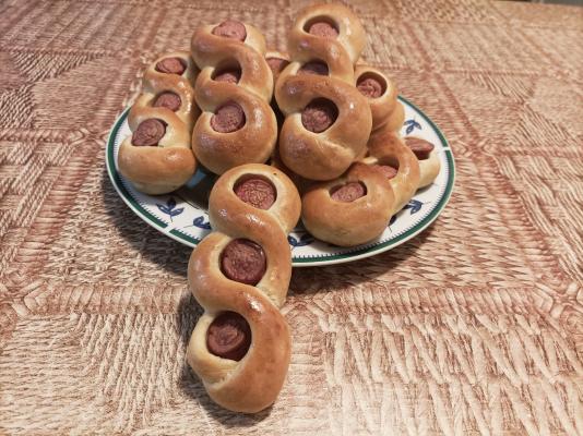 Uzeti jednu lopticu testa, rukama je malo razvući, uviti u rolatić i rukama, valjanjem, izdužiti rolatić u valjak dužine 38 cm. Sada, saviti testo na pola, staviti komad viršle, prebaciti desnu traku testa ispod viršle, pa levu traku testa prebaciti preko desne i ponoviti postupak još dva puta. Krajeva podaviti ispod testa. Na isti način uraditi i sa ostalim lopticama testa.