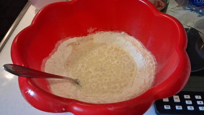 U šolji mlakog mleka rastvoriti kvasac, pa dodati šećer i ulje. Prosejati brašno, malo posoliti, pa u sredinu sipati aktiviran kvasac.