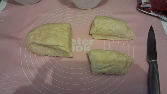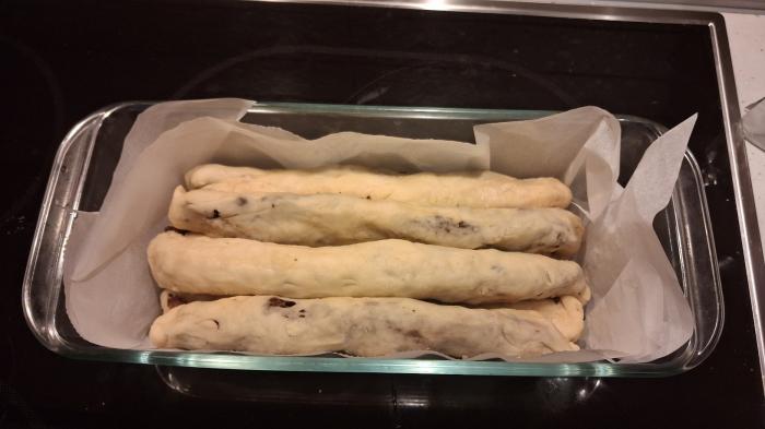 Zamesiti glatko testo i ostaviti ga da naraste na duplu zapreminu. Tada ga premesiti i podeliti na dva dela. Jednu polovinu opet preseći na pola.