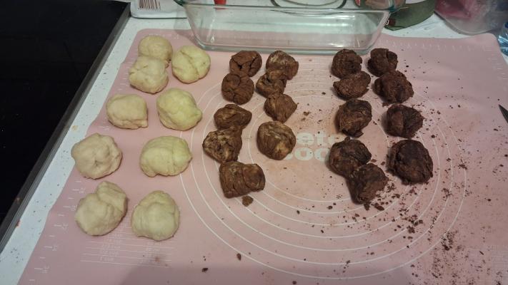 Prvu polovinu podeliti na 9 loptica. Od ostaka testa u jednu četvrtinu dodati kašiku kakaoa i premesiti dok sasvim ne pokupi sav kakao. U drugu četvrtinu dodati 2 kašike kakaoa i 50 g otopljene crne čokolade. I nju premesiti da se dobro izmešaju kakao i čokolada u testu. Oba tamna dela testa podeliti na po 9 loptica i ostaviti da se testo malo odmori, jer kakao i čokolada ga stežu.