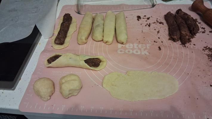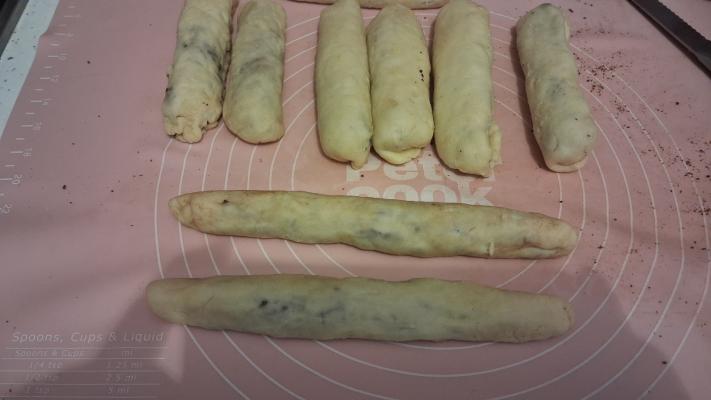 Opet ostaviti testo da malo odmori (10-15 minuta), pa svaki valjčić razvući na dužinu tepsije u koju ćete ih slagati za pečenje.