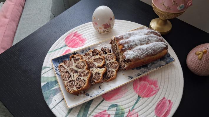 Omekšane svetlije kuglice sa kakaom rastanjiti u valjčiće koji su otprilike pola dužine kalupa u kome će se peći hleb. Najtamnije testo tanjiti oklagijom na istu dužinu, pa u njega umotavati valjčiće koje ste prethodno napravili. Zatim rastanjivati belo testo i u njega umotavati tamno.