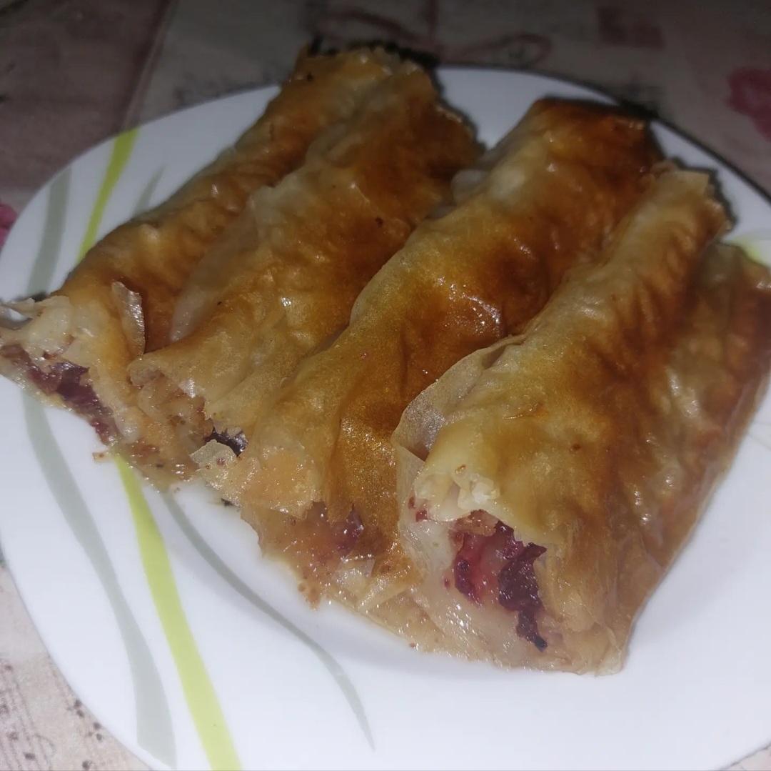 Kore nauljiti i na početak kore staviti očišćene višnje i preko njih mlevenu plazmu. Saviti pitu, ređati u nauljen pleh. Premazati sa malo ulja i peći. Gotovu vruću pitu preliti vrućim sirupom. Sirup praviti tako što prokuvamo vodu i šećer i po želji dodati par kolutova limuna. Dekorisati po želji i služiti.