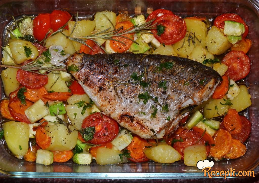 Kako orada nije dobila rumenu boju, kratko sam je propržila na malo ulja u tiganju, sa jedne i druge strane i vratila u vatrostalni sud na povrće. Pospite i malo svežeg peršuna.