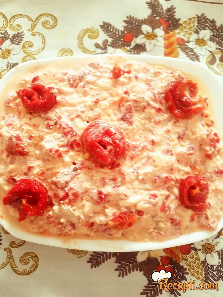U posudu stavite seckanu papriku, rendana jaja, rendan kačkavalja, izmrvljen ili izrendan feta sir i majonez, pa sve lagano izešajte. Posolite po ukusu, dekorišite po želji, ohladite pa poslužite.