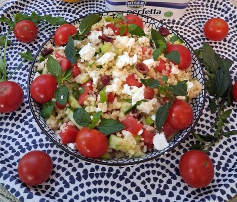 Na kraju dodati izmrvljen sir i brusnice po vrhu. Dekorisati čeri paradajzima i listićima nane. Prijatno!