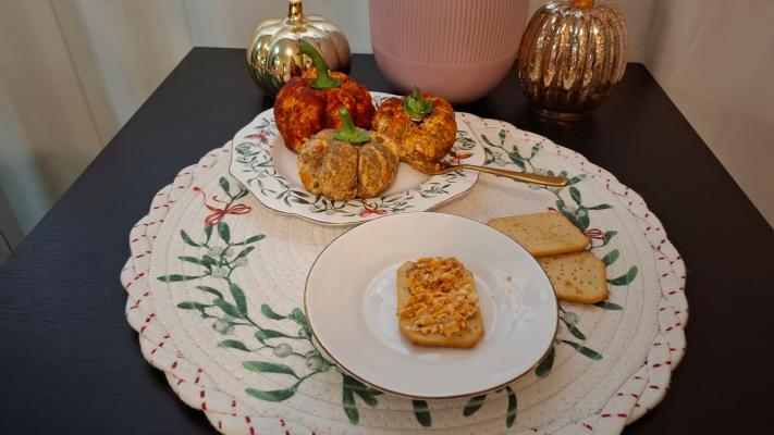 Podeliti smesu na pola. Od prve polovine napraviti jednu veću lopticu i na tanjiru obloženom folijom uvaljati u alevu papriku. Zatim foliju skupiti oko loptice, stisnuti na vrhu i pomoću tri gumice napraviti zareze kao na bundevi.