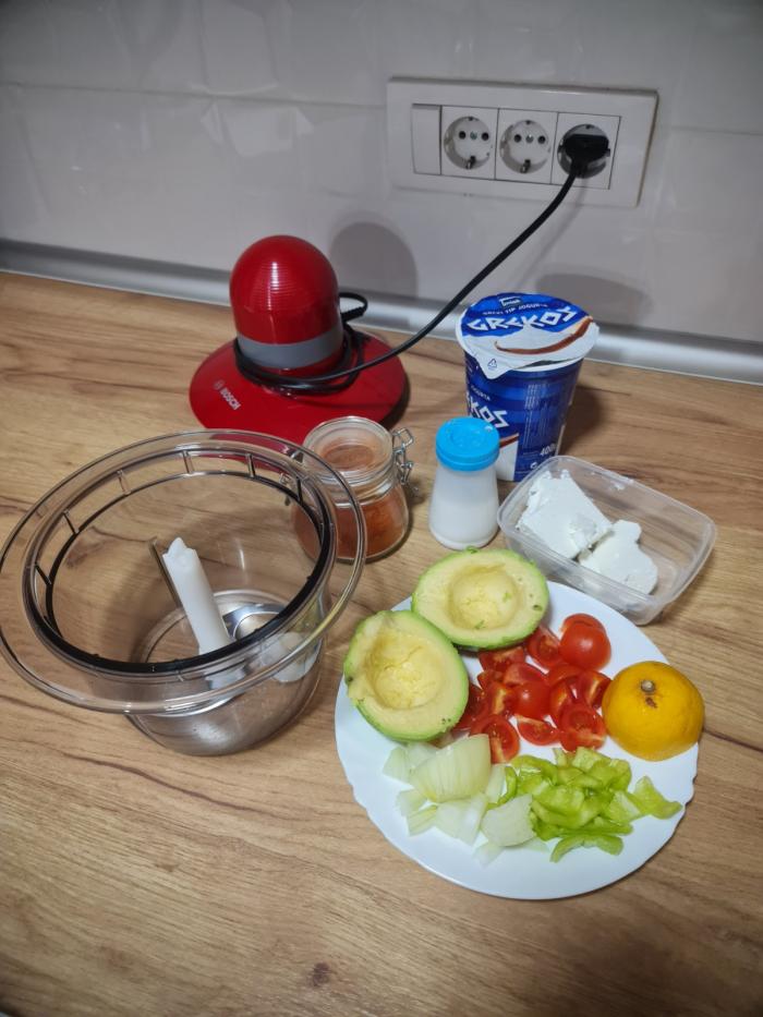 Izblendajte zelenu papriku, crni luk, avokado, grki jogurt i sitan sir.