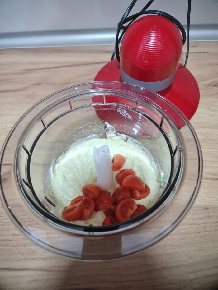 Dodajte malo crvene paprike, malo čilija, soli i oko 5 čeri paradajza ili 1 manji paradajz.