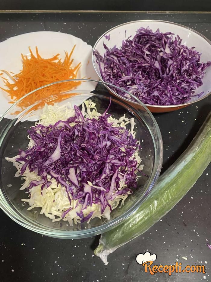 U dublju činiju za salatu narendajte beli kupus, zatim ljubičasti, narendajte šargarepu.