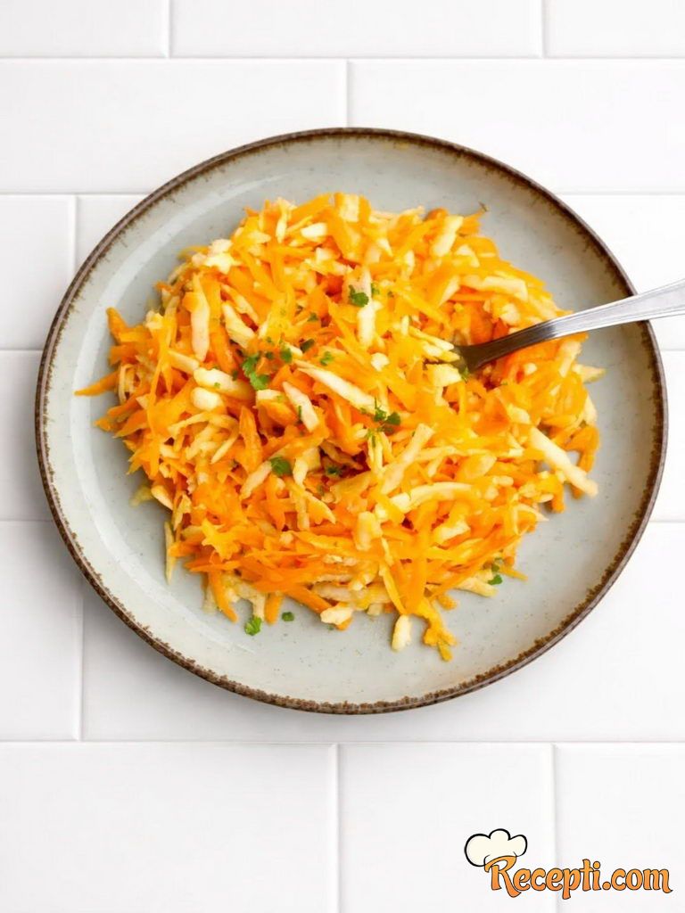 Šargarepu i celer očistiti, oprati i dobro osušiti. Narendati na krupno prvo šargarepu, zatim celer i odmah dodati sirće, kako celer ne bi potamneo.