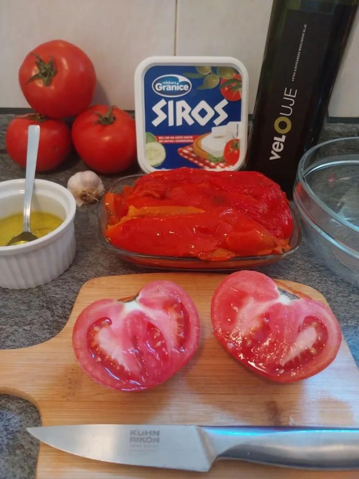 - 3 srednje crvene paprike (pečene i oljuštene)