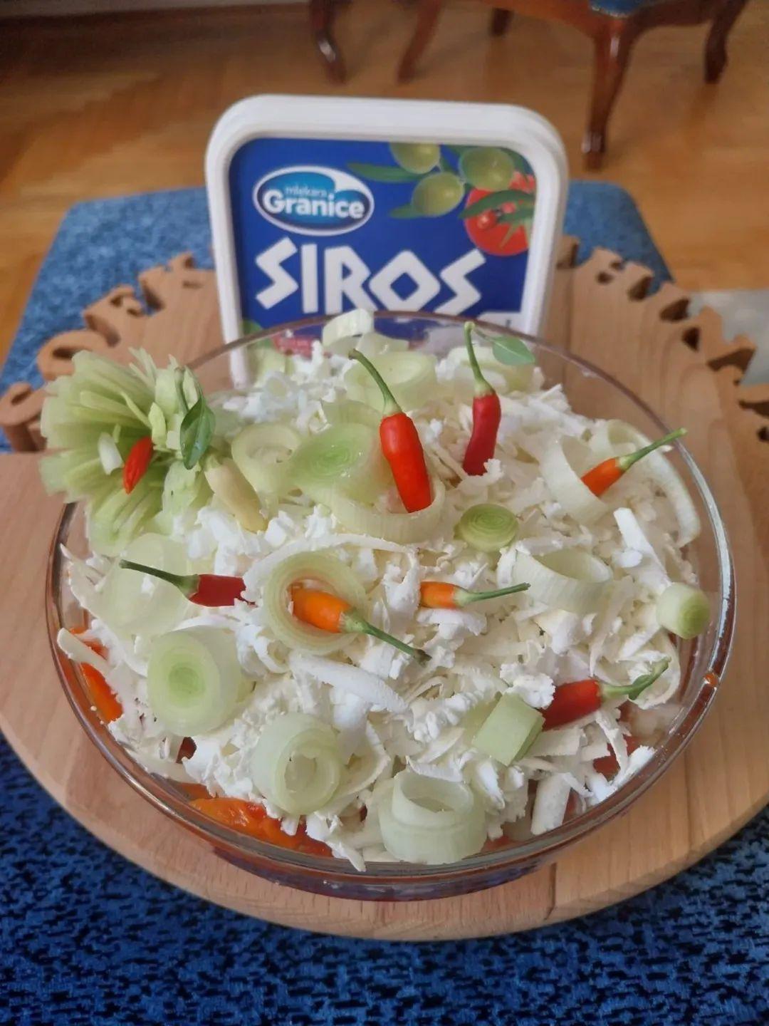 Papriku i praziluluk iseći na sitnije kockice, paradajz iseći na krupnije kockice. U jednu veću činiju sipati povrće. Dodati izblendani beli luk. Začiniti uljem, sirćetom i posoliti. Sve zajedno sjediniti. Preko salate izrendati feta sir. Prijatno.