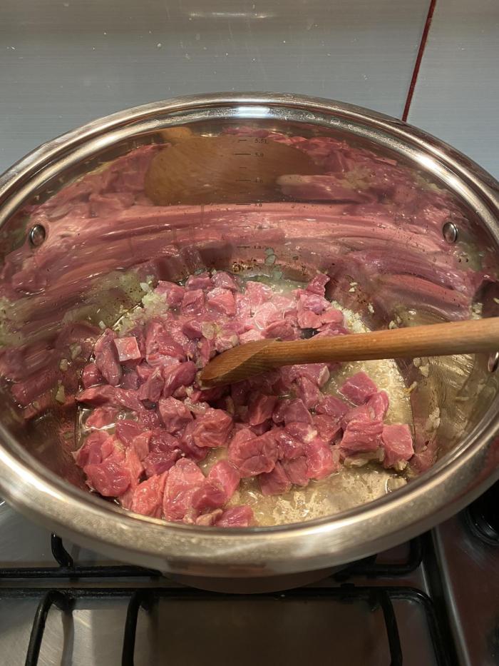 Dodajte juneće meso i pržite dok ne promeni boju.