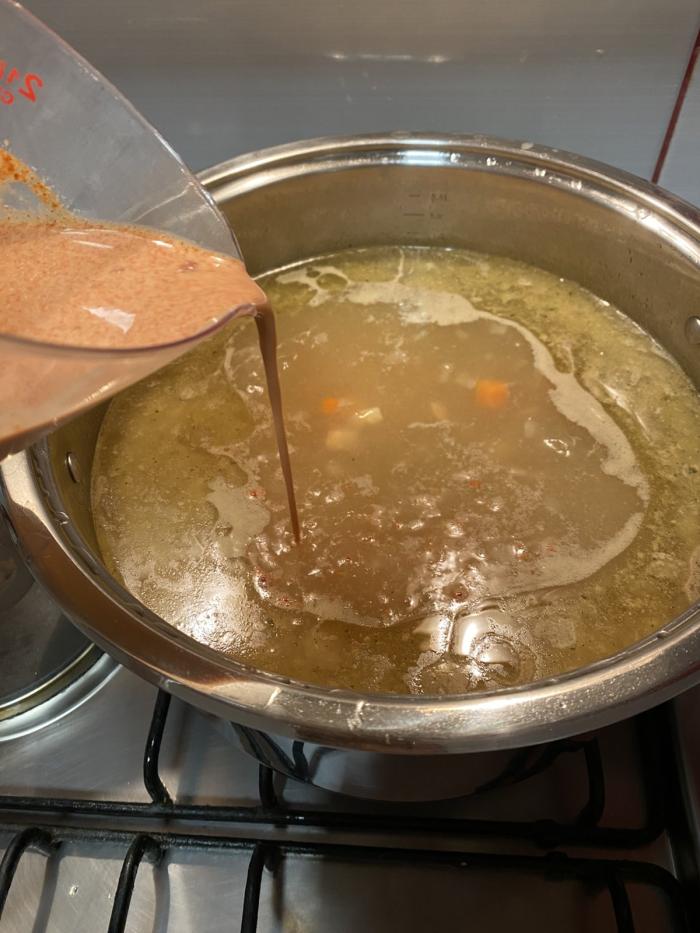 Pripremite hladnu zapršku. Brašno i mlevenu papriku dobro umešajte u mleko kako ne bi bilo grudvica, sipajte u čorbu dok vri i neprestano mešajte dok se ne zgusne. Kuvajte još oko 15 minuta.