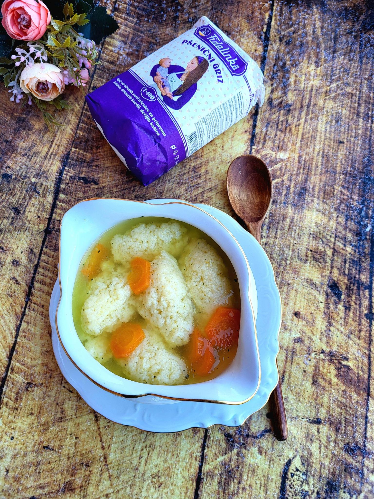 Belance prvo lagano umutiti viljuškom dok ne postane penasto. Zatim dodati žumance i sjediniti. Postepeno dodavati griz i mešati dok se ne dobije glatka smesa. Ostaviti da odstoji 10–15 minuta, da griz nabubri.