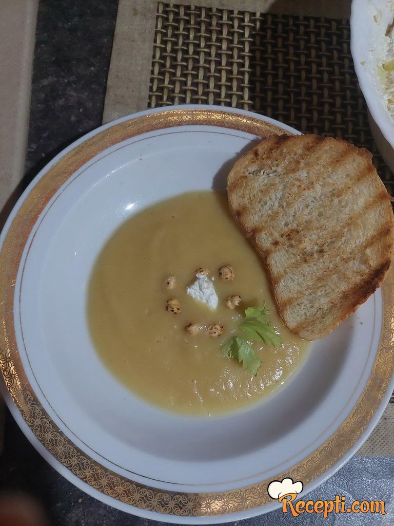 Voda se po potrebi doliva. Kada je skuvano skiniti s vatre. Ručnim mikserom izmiksati supu. Gustina zavisi od količine vode.