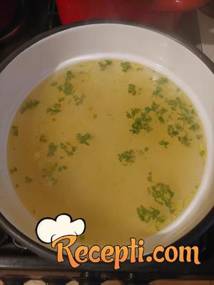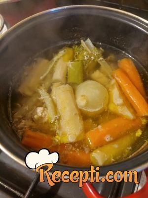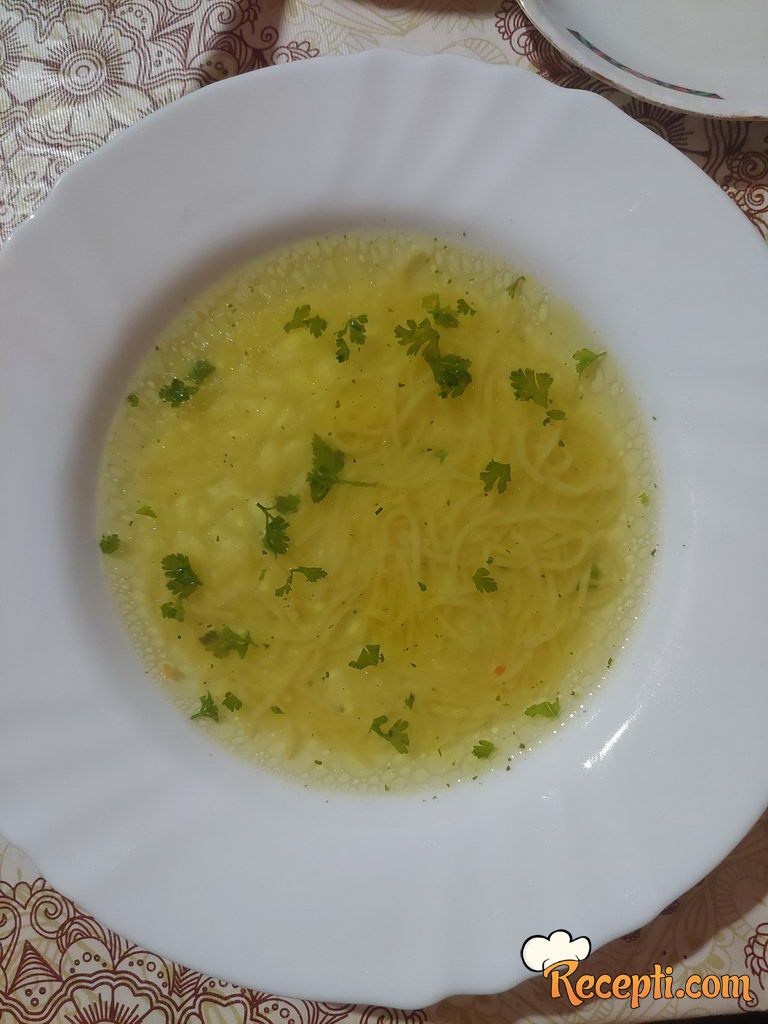 Supa kod mene neizostavna. Piletina je bila malo jača kilaža pa je supa ispala lepa žuta. Povrće se može koristiti i karelaba i karfiol, ali je nisam imala. Što više vrsta povrća tim je ukus bolji. Meso poslužla sa krompirom kuvanim i paradajz sosom.
