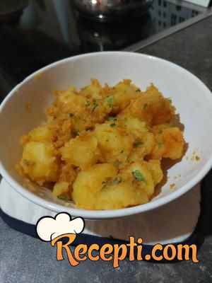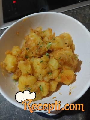 Krompir oguliti i skuvati u slanoj vodi. Na masti popržiti sitno seckan crni luk. Dodati oceđen krompir. Posuti alevom paprikom i seckanim peršunovim listom. Posoliti po ukusu.