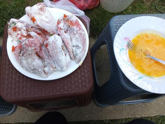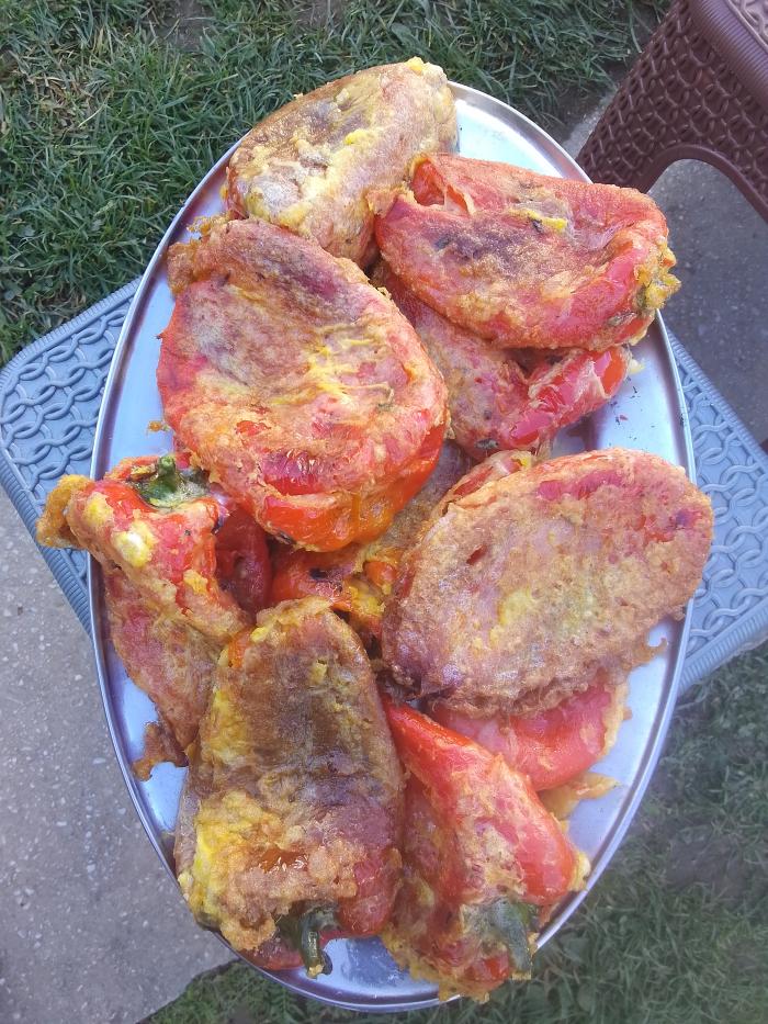 Prethodno pečene paprike koje su stajale oljuštiti i posoliti sa svih strana, ne previše. U dublju posudu sipati brašno, malo soli i bibera mlevenog. Uvaljati papriku sa svih strana, odjednom sve i slagati ih na veći plitki tanjir.