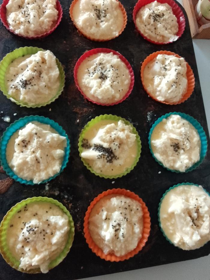 Sve lepo sjediniti i sipati u kalupe za mafine obložene papirnim korpicama ili silikonskim. Posuti sa susamom i čija semenom.