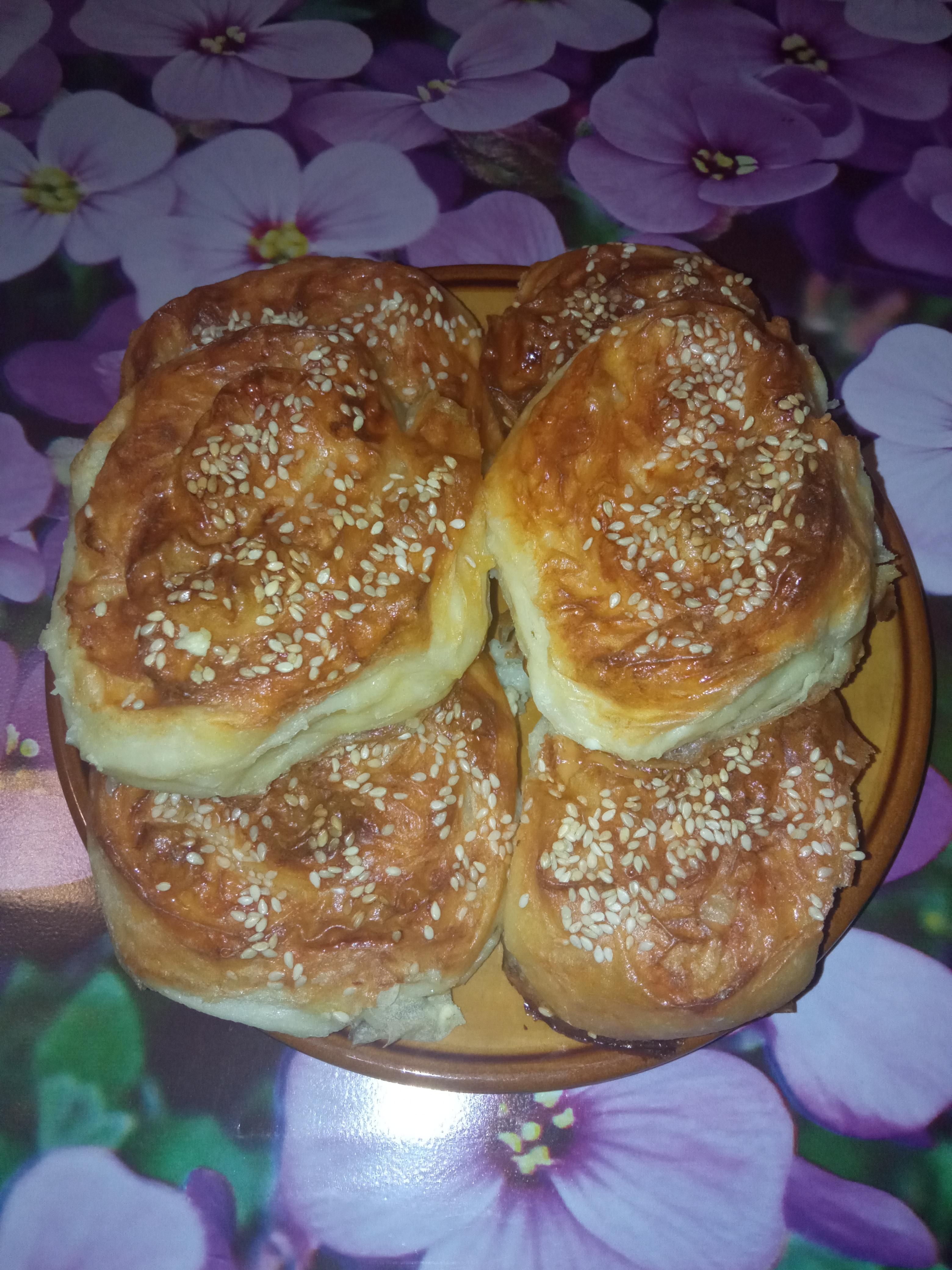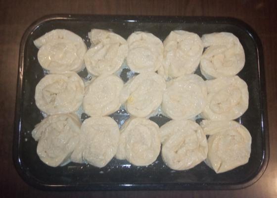 Ređati u podmazan pleh. Ponoviti dok se utroše kore. Malo fila od jaja i jogurta ostaviti da se premažu pužići, ko voli može preko pužića posuti i sir. Odozgo posuti susam.