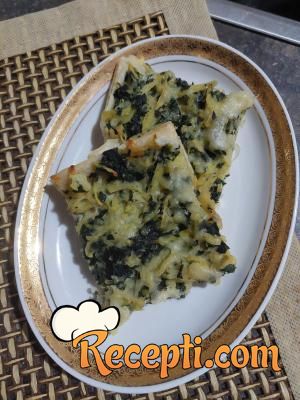 Lisnato testo staviti u veliki pleh. Preliti sa smesom. Zagrejati rernu na 180 stepeni i peći pitu oko 30 minuta.
