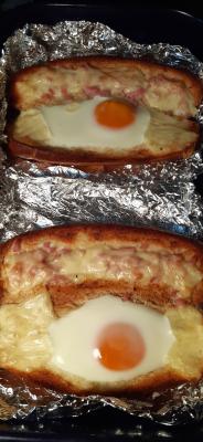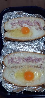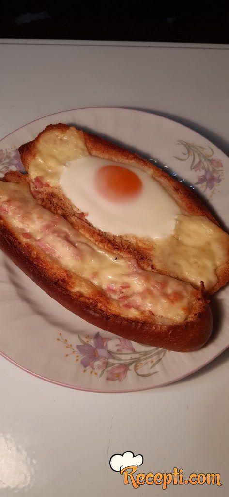Na jednu polovinu kifle stavite razbijeno jaje, a na drugu naseckanu salamu ili suhomesnato, može i slaninica.