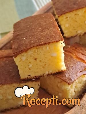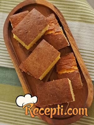 Posle toga sipati smesu u posudu, smanjiti rernu na 200 stepeni i peći 25 do 30 minuta dok ne dobije lepu koricu. Malo prohladiti i seći na kocke.