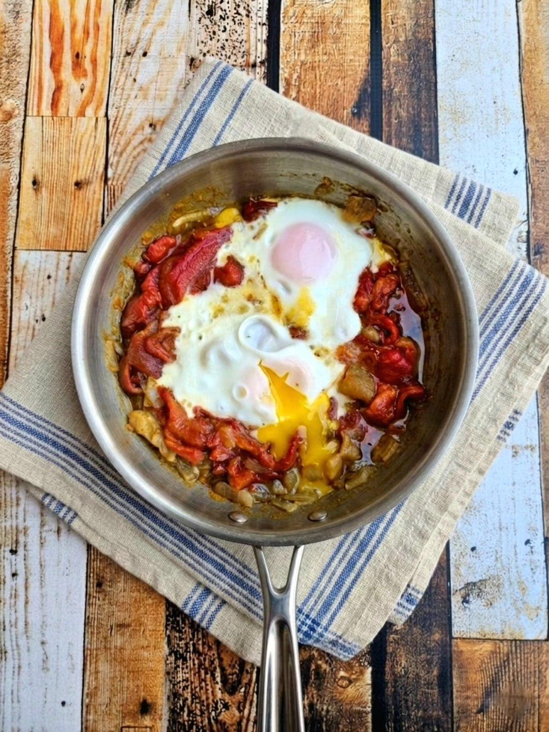 Pečenim paprikama ukloniti kožicu i semenke, pa ih naseckati na sitne komade. Zagrejati ulje u tiganj (da prekrije dno). Dodati papriku u ulje i pržiti nekoliko minuta. Zatim začiniti i napraviti dva udubljenja u koja cete polomiti jaja. Poklopiti da se jaja malo isprže, ali da ostanu rovita.
