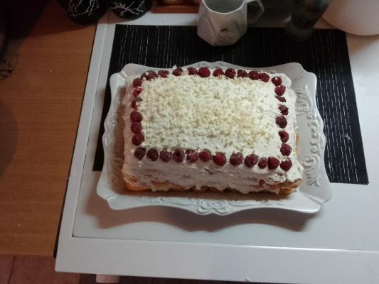 Piškote umakati u mleko i slagati na tacnu za tortu, preko fil, pa maline, tri sloja piškota, tri sloja fila.