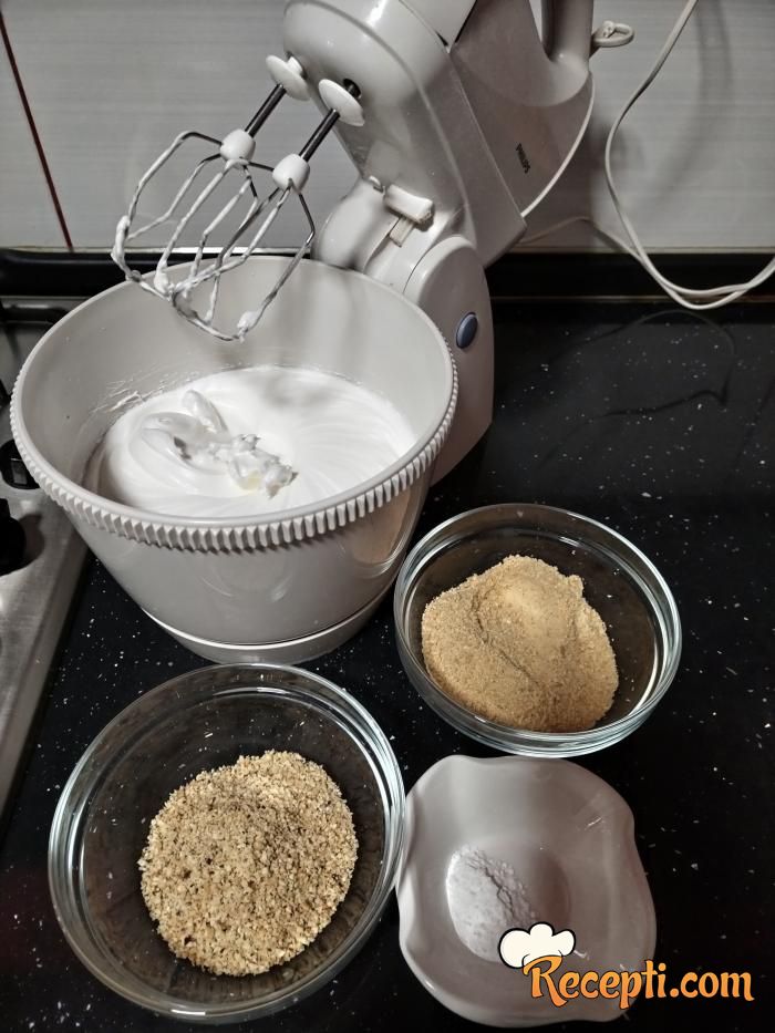 Za koru odvojite belanca od žumanaca pa belanca lagano umutite dodajući šećer.