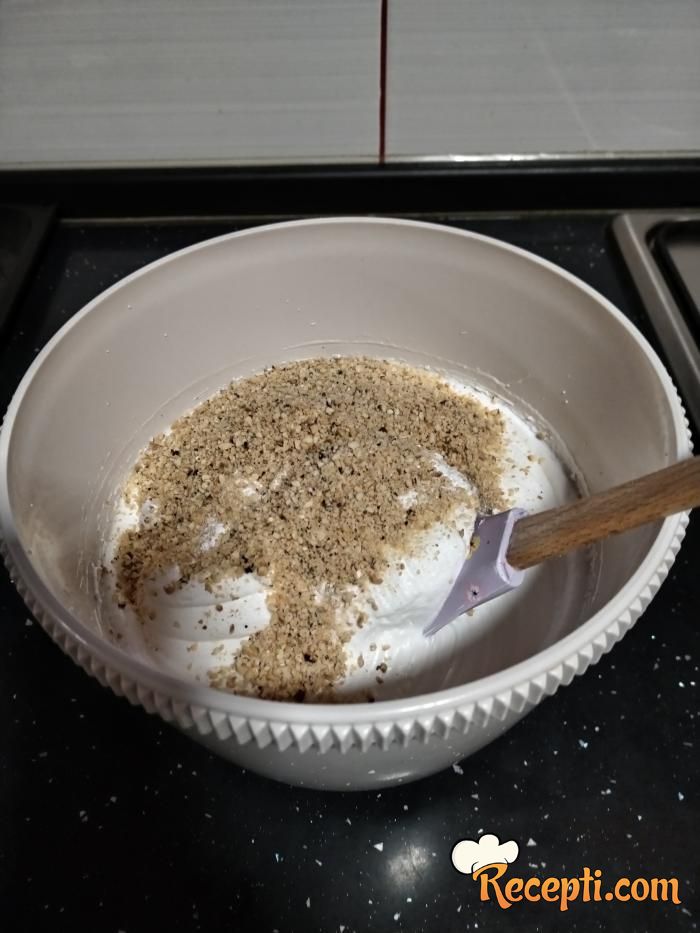 Potom dodajte mlevenu plazmu, lešnik i prašak za pecivo pa to lagano špatulom sjedinite.