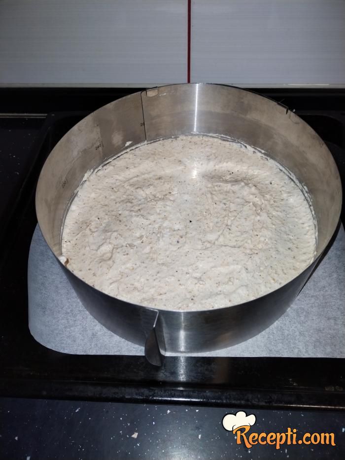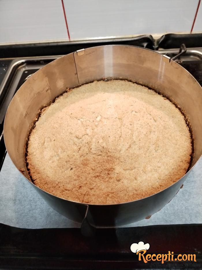 Kalup obložite papirom za pečenje, ravnomerno rasporedite smesu i pecite nekih 15 minuta na 180 stepeni ili dok ne porumeni.