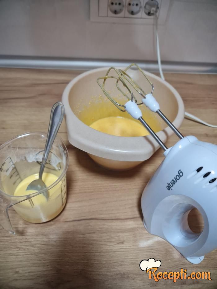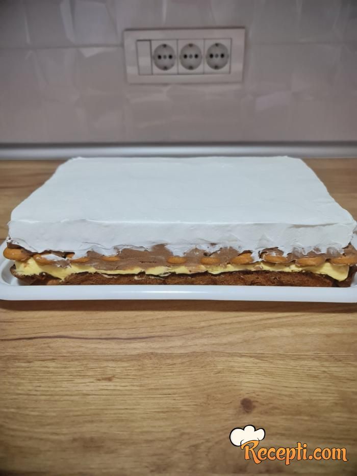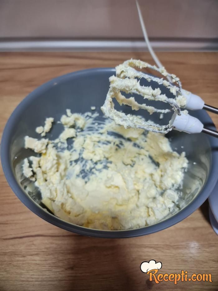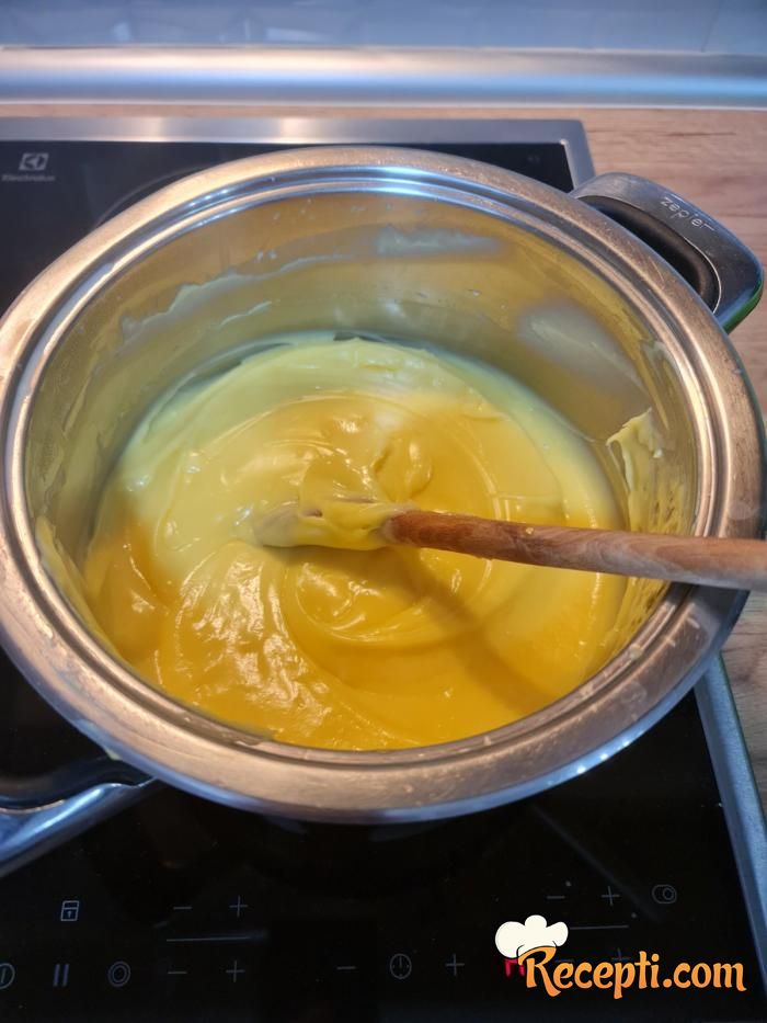 Za fil 6 žumanaca umutite mikserom sa 4 kašike šećera, a posebno izmešajte puding od vanile (prašak) sa 1 dl mleka pa sve spojite i dobro izmešajte. Možete dodati i jednu kašiku gustina.