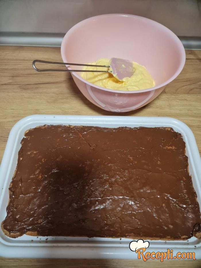 Penasto umutite jedan margarin, pa dodajte u ohlađen fil i sve dobro izmiksajte pa podelite na dva dela. U jedan deo stavite istopljenu čokoladu, a u drugi deo ostavite žut.