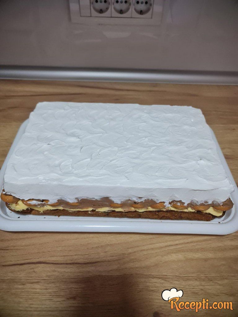 Za koru ulupajte belanca sa šećerom u čvrst sneg pa dodajte orahe i mleveni plazma keks, promešajte polako pa pecite u podmazanom plehu u prethodno zagrejanoj rerni.