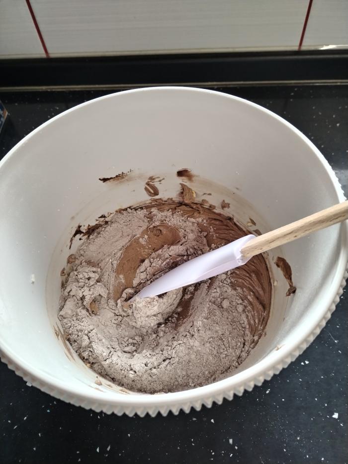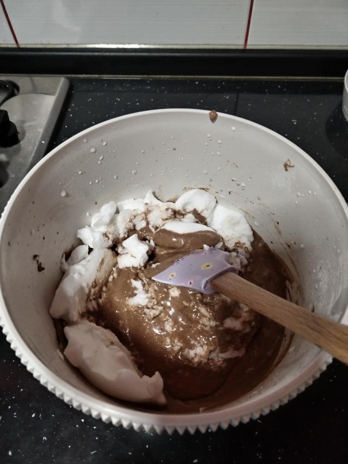 Dodajte brašno, kakao i prašak za pecivo, lagano umešajte žicom.