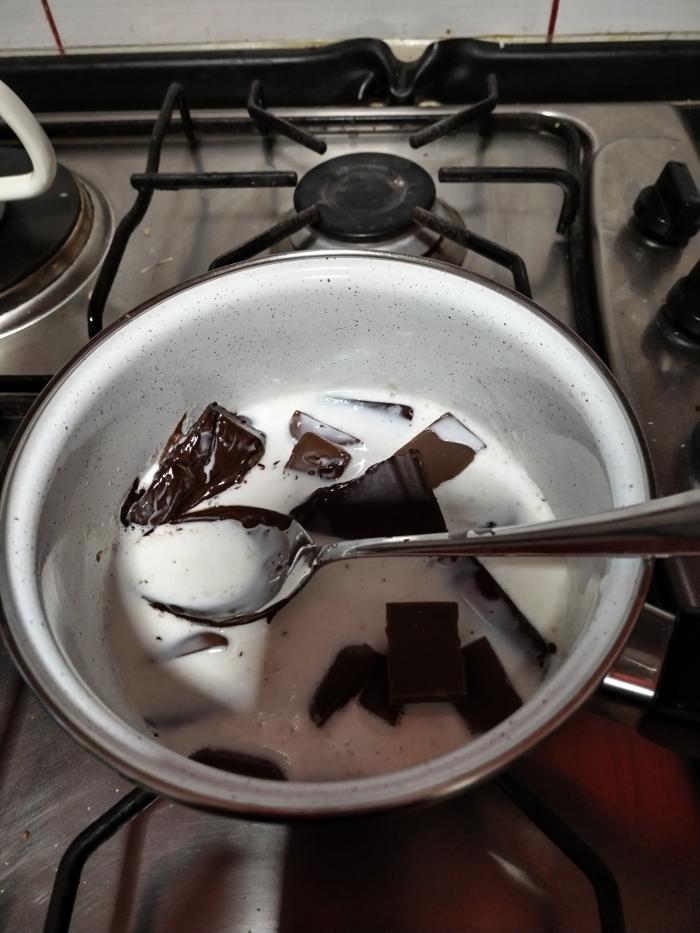 Ganache preliv: Ugrejte pavlaku do vrenja, prelijte preko čokolade, sjedinite.