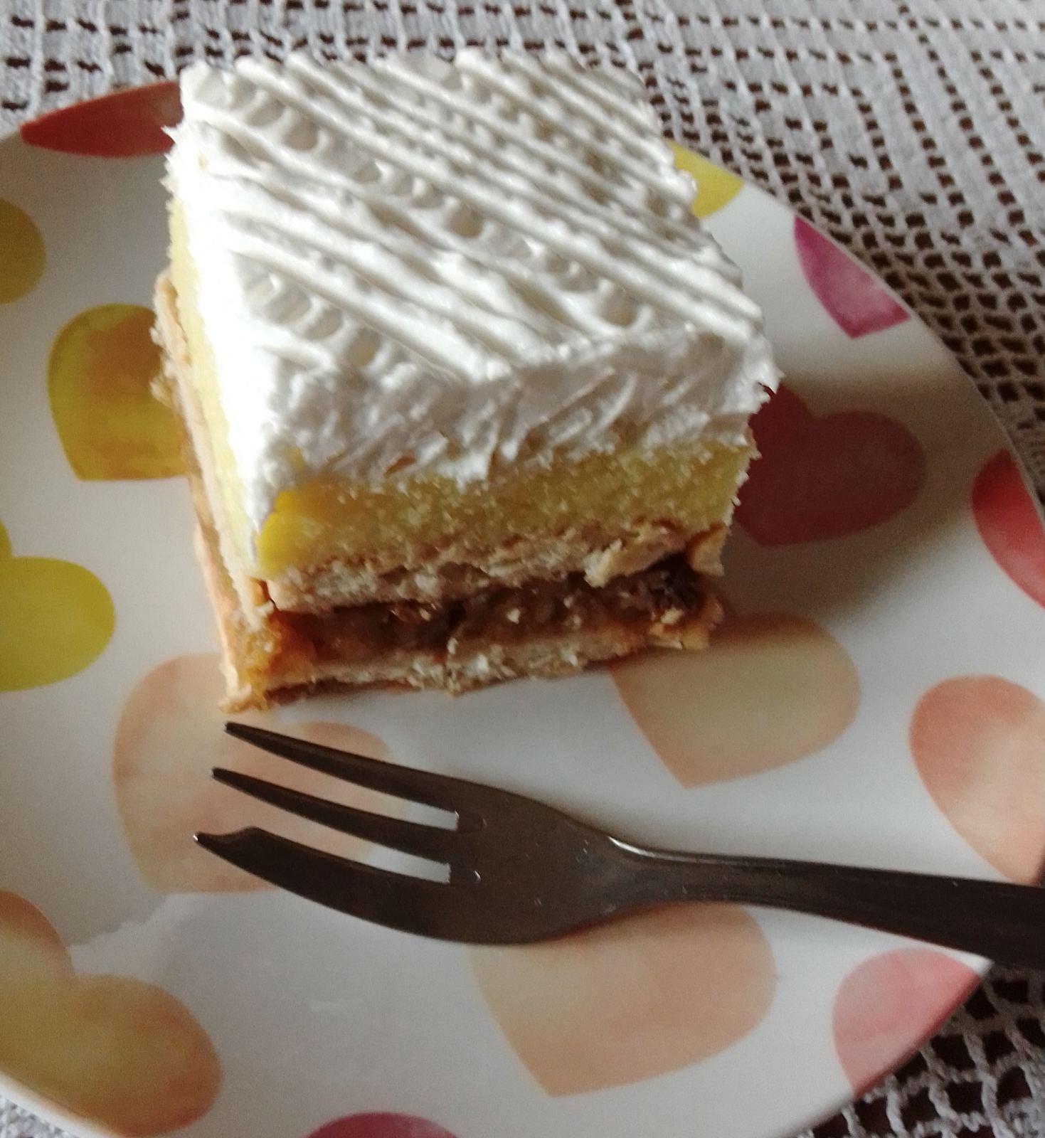 Poređati kekt po plehu 28/20 cm. Jabuke izrendati, propržiti sa šećerom, suvim grozžem dodati cimet i vruće rasporediti po keksu i staviti sloj keksa umočen u mleko. U mleku skuvati puding sa šećerom, dodati margarin, mešati da se otopi dodari kokos i prepamzati preko keksa. Umutiti šlag sa kiselom vodom i premazati preko ohlađenog kolača i ukrasiti po želji.