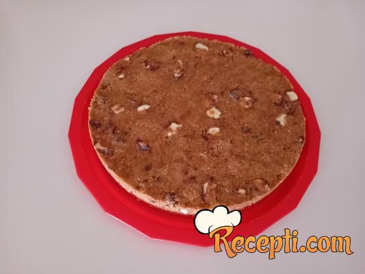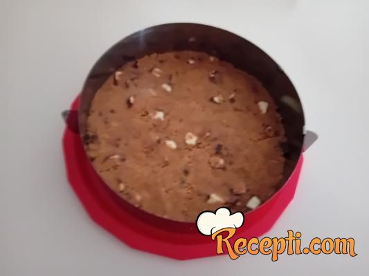 Obruč za tortu staviti na tacnu i rasporediti pripremljenu smesu. Ostaviti u frižider da se stegne.