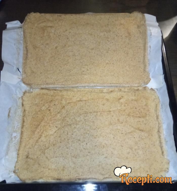 Umutiti 6 belanca sa 6 kašike šećera, kad se umuti čvrst sneg, dodati 5 kašike brašna i 5 kašika mlevenih oraha. Izmešati špatulom. Izliti smesu u pleh obložen pek papirom. Koru peći na 180 C 10-15 minuta. Napraviti još jednu koru. Ostaviti kore da se ohlade.