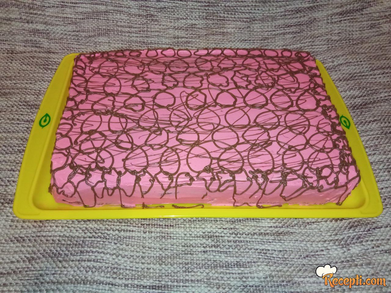 Tortu dekorisati po želji.Umutiti šlaga po uputstvu sa kesice,po želji obojiti šlag željenom bojom za kolače,premazati tortu.Otopiti čokoladu i išarati preko šlaga.